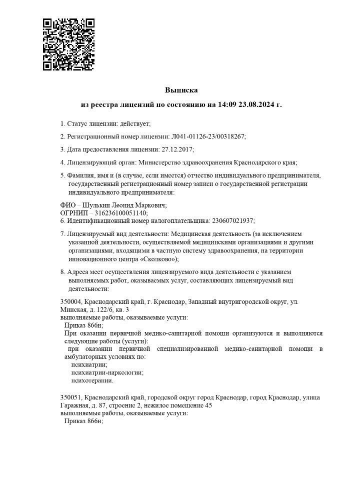 С 2017 г по н.в. – психиатр, психиатр-нарколог, психотерапевт, психоаналитик ИП Шулькин Л.М.